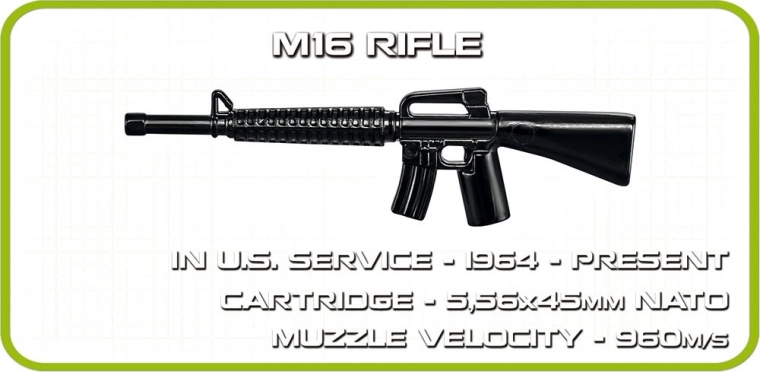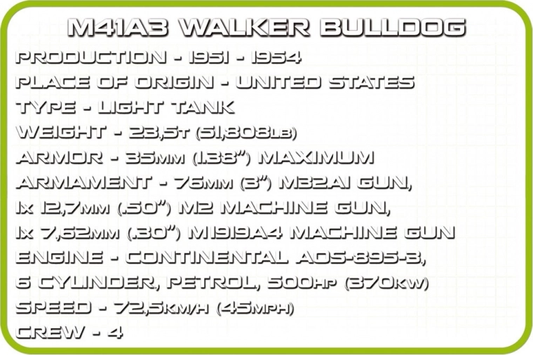 De set bevat 2 gedetailleerde Amerikaanse soldatenminifiguren met accessoires en een plaatje met de naam M41A3 Walker Bulldog voor een fraaie presentatie van het model.