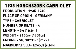 Ontdek de iconische cabriolet HORCH 830BK als gedetailleerde bouwset op schaal 1:35. De set van COBI biedt 243 hoogwaardige onderdelen, nauwkeurige bedrukkingen zonder stickers, hoge compatibiliteit met andere merken en bovendien een minifiguur geïnspireerd door Stefan Starzyński. Ideaal voor liefhebbers van autogeschiedenis en verzamelaars.