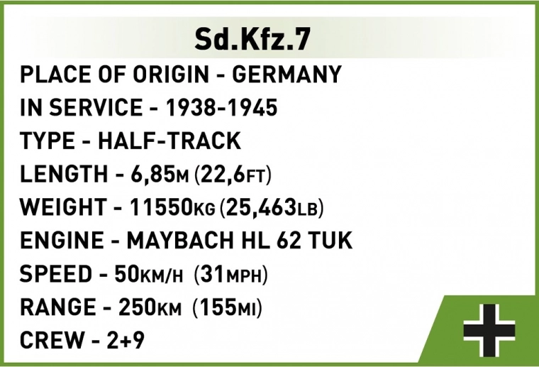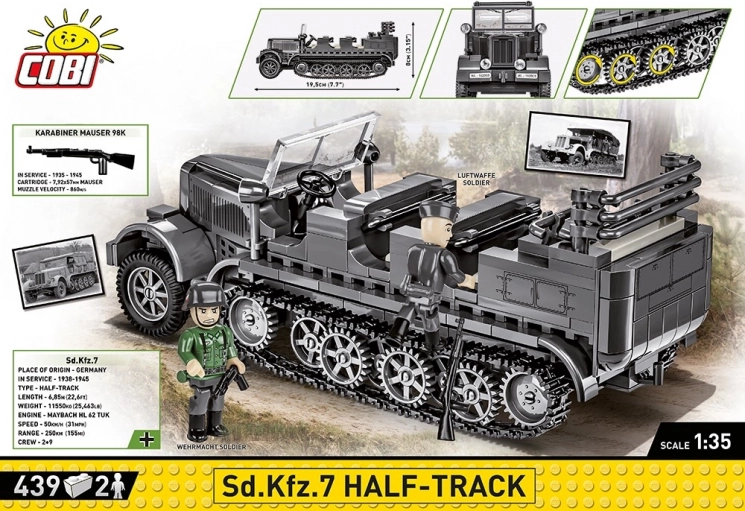 COBI Sd.Kfz. 7 Half-Track is een realistisch model van een historische halftrack-artillerietrekker die tussen 1934 en 1945 werd geproduceerd. Deze set op schaal 1:35 focust op nauwkeurige details, functionele elementen en hoge afwerkingskwaliteit. Dankzij de duurzame prints en doordachte constructie is hij perfect voor zowel verzamelaars als enthousiaste bouwers.