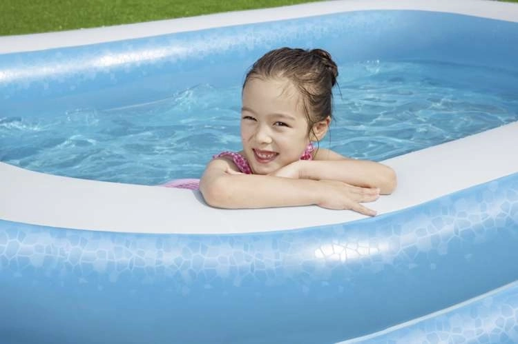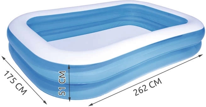 • SPECIFICATIES - Bestway productcode: 54006; materiaal: vinyl; uitvoering: 2 gelijke ringen / brede zijwanden / aftapventiel voor het legen; leeftijd: vanaf 6 jaar; capaciteit: 778 liter; afmetingen (lengte / breedte / hoogte): 262x175x51cm; gewicht: 4,5 kg