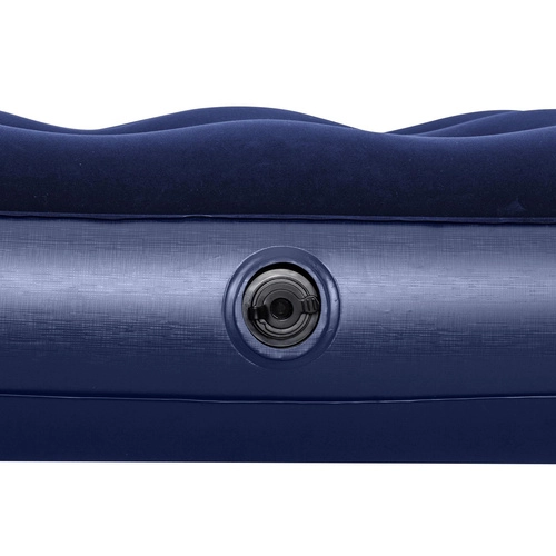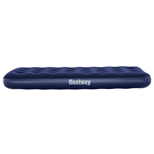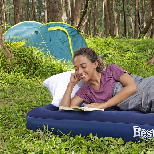 Praktisch opblaasbaar matras voor één persoon met afmetingen 185 × 76 × 22 cm van het merk BESTWAY, ideaal voor thuis en op reis. Het heeft een aangenaam velours oppervlak, een duurzame coil-beam constructie, een veiligheidsventiel voor eenvoudig opblazen en leeglaten, en in de verpakking vind je ook een zelfklevende reparatiepatch.