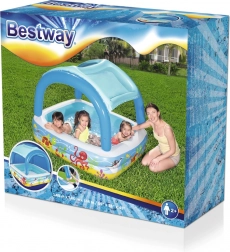 Dit kinderopblaasbaar zwembad van het merk Bestway is gemaakt van duurzaam vinyl materiaal, dat langdurig speelplezier en veiligheid garandeert. Het zwembad bevat twee gescheiden opblaasbare ringen, die stabiliteit en veiligheid bieden, terwijl de opblaasbare luifel de kinderen beschermt tegen schadelijke zonne-energie. Er wordt ook een waterdichte reparatiepatch meegeleverd, waarmee het zwembad zelfs in het water kan worden gerepareerd.