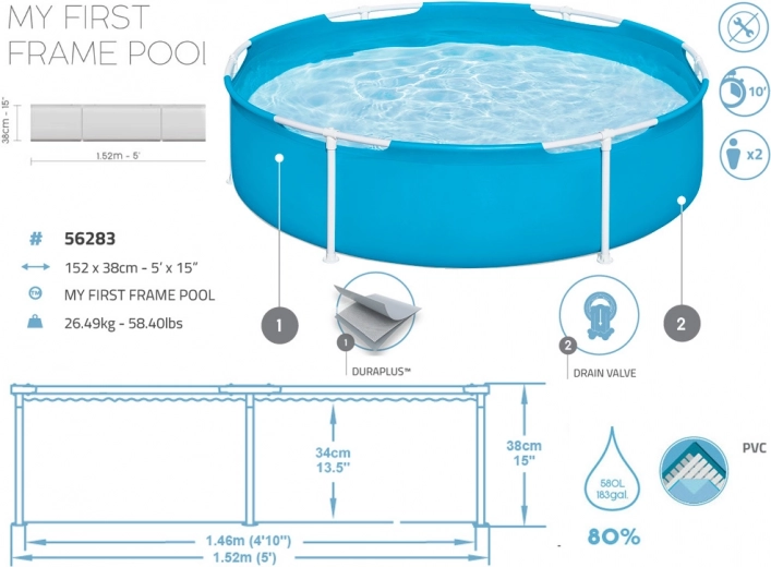 Het opzetten van het zwembad is zeer eenvoudig en snel, waardoor het in korte tijd gebruiksklaar is en je meteen van waterpret kunt genieten.