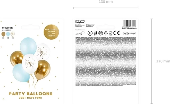 Stijlvolle set verjaardagsballonnen met de opdruk One in een combinatie van pastel lichtblauw, smetteloos wit en glanzend goud. Ideaal voor de eerste verjaardag, diameter 30 cm, verpakking 6 stuks. Meer tonen