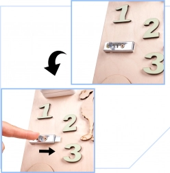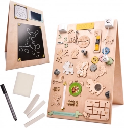 Een unieke functie van dit bord is de dubbelzijdigheid - één zijde bevat talrijke manipulatieve elementen en de andere dient als een oppervlak om te tekenen en te schrijven met krijt, stiften of potloden. Dit helpt kinderen hun creativiteit en fijne motoriek te ontwikkelen.