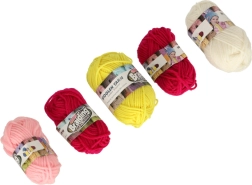 De set bevat een breimachine, garen in 5 kleuren, een haaknaald en een plastic naald – alles wat je nodig hebt om te creëren.