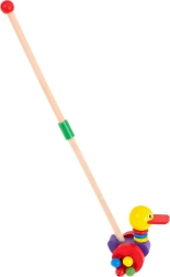 Deze kleurrijke houten eend is de ideale metgezel voor wandelingen. Het is ontworpen om kindermotoriek en beweging te ondersteunen. Dankzij de gemakkelijk te bedienen houten stok kan de eend worden voortgetrokken of kan ermee zelfstandig worden gespeeld.