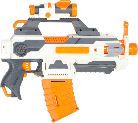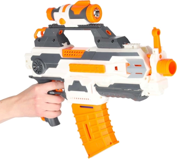 - Blaster met tactische rails, zaklamp, afneembare loopdemper, 2 magazijnen (6 en 10 pijltjes), 30 schuimpijltjes, kolf met houder voor magazijn, handleiding met afbeeldingen