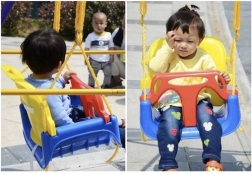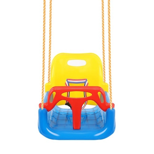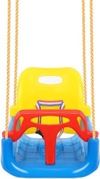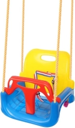 Deze kleurrijke 3-in-1 schommel is een geweldige keuze voor peuters en oudere kinderen. In de configuratie met T‑bar en hoge rugleuning vervoert hij de kleintjes veilig; later kun je de voor- en achterdelen verwijderen en hem omtoveren tot een klassiek zitje. Verstelbare veiligheidsgordels houden het kind stevig vast, terwijl de antislipstructuur van het zitje wegglijden voorkomt, ook bij uitbundig speelplezier.