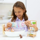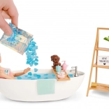 De set bevat een vrijstaand bad met afleg-dienblad, een plank in houtlook en tal van accessoires: grote en kleine borstel, flesje balsem, zeep, kaars, plantje, decoratieve tekst en een schattig hondje. De plank en het dienblad hebben praktische houders, zodat de accessoires tijdens het spelen op hun plek blijven.
