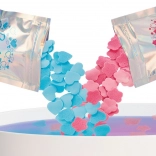 Twee hersluitbare zakjes oplosbare confetti in roze en blauw veranderen de tint van het water – meng ze en creëer een paars bad voor nog meer plezier.