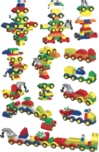 Modulaire onderdelen maken steeds nieuwe modellen mogelijk. Kinderen kunnen voertuigen naar wens samenstellen, uit elkaar halen en verbeteren volgens hun eigen fantasie.
