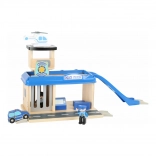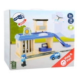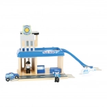 Het realistische small foot politiebureau stimuleert de fantasie en fijne motoriek. Twee verdiepingen, een toren met helikopterplatform, een functionele cel met uitschuifbaar traliewerk en een parkeerramp creëren een doordachte speelomgeving. De set bevat een politieauto, helikopter en twee beweegbare figuren – een politieman en een boef – voor eindeloze speelscenario’s.
