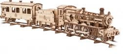 De locomotief, tender en het personenrijtuig vormen een indrukwekkende set met realistische details. In de doos zit ook een kort stuk spoor waarop het model kan rijden en waarop het tevens stijlvol opvalt als decoratie.