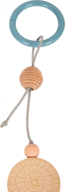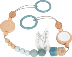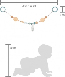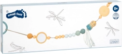 Deze design kinderwagenketting SMALL FOOT in natuurlijke stijl valt op door de combinatie van houten kralen in verschillende maten, zachte pasteltinten en textiele elementen. Dankzij het elastische koord past hij zich aan verschillende typen kinderwagens of handgrepen aan en blijft hij dankzij drukknoppunten op de bevestigingsringen betrouwbaar op zijn plek. De stoffen libelle met krinkelende vleugels ondersteunt de zintuiglijke waarneming en de fijne motoriek van je baby.