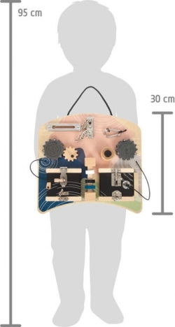 Deze stijlvolle Montessori busy board in prettige pasteltinten biedt kinderen volop ontdekplezier. Diverse sloten en grendels uit het dagelijks leven, tandwielen met mini-doolhof, een draadstang met draaielementen en een leuke toeter met piepgeluid ontwikkelen spelenderwijs vaardigheden en motiveren tot natuurlijk leren.