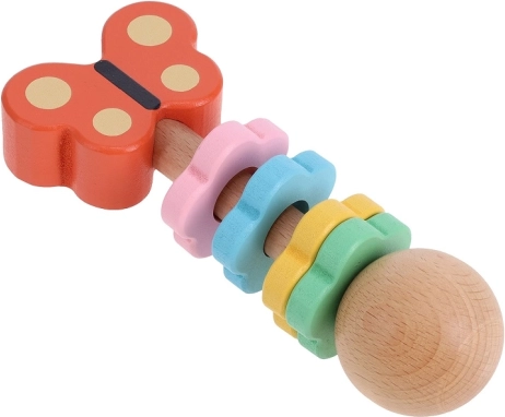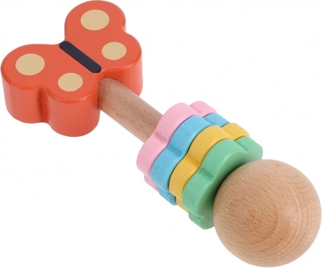 Vrolijke houten rammelaar met kleurrijke ringen voor de ontwikkeling van de fijne motoriek en de eerste muzikale ervaringen. Gemaakt van FSC-gecertificeerd beukenhout voor een milieuvriendelijke ontwikkeling van je kind.