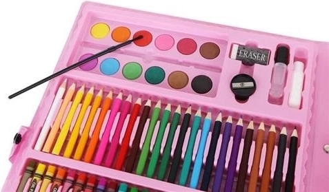 Rijke selectie: 24 kleurpotloden, 24 stiften, 48 waskrijtjes, 48 oliepastels, 12 aquarelkleuren en praktische accessoires. Alles voor tekenen, inkleuren en schilderen met aquarel.