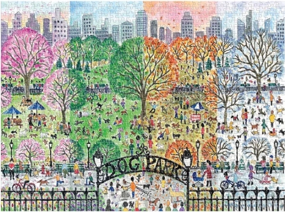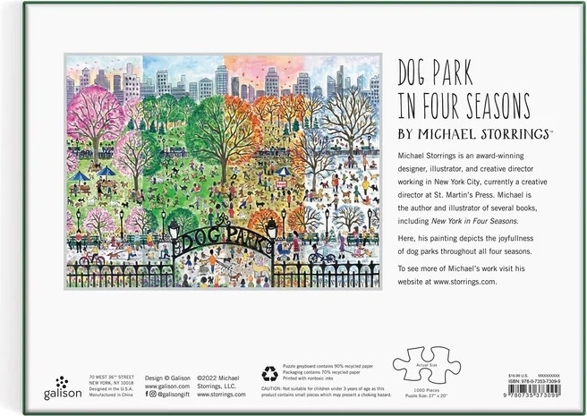 Geniet van ontspanning én uitdaging met deze prachtig uitgewerkte puzzel van 1000 stukjes met een illustratie van een stedelijk hondenpark in vier seizoenen door Michael Storrings. Hoogwaardige print met veilige inkten, matte afwerking voor natuurgetrouwe kleuren en details, en een stevige geschenkdoos van duurzame materialen maken deze puzzel tot een ideaal cadeau en verzamelobject.