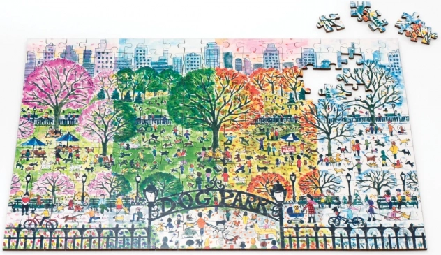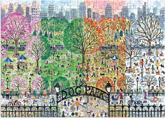 Het originele motief van het Hondenpark in vier seizoenen van de bekroonde illustrator brengt kleur, detail en plezier in elk stukje.