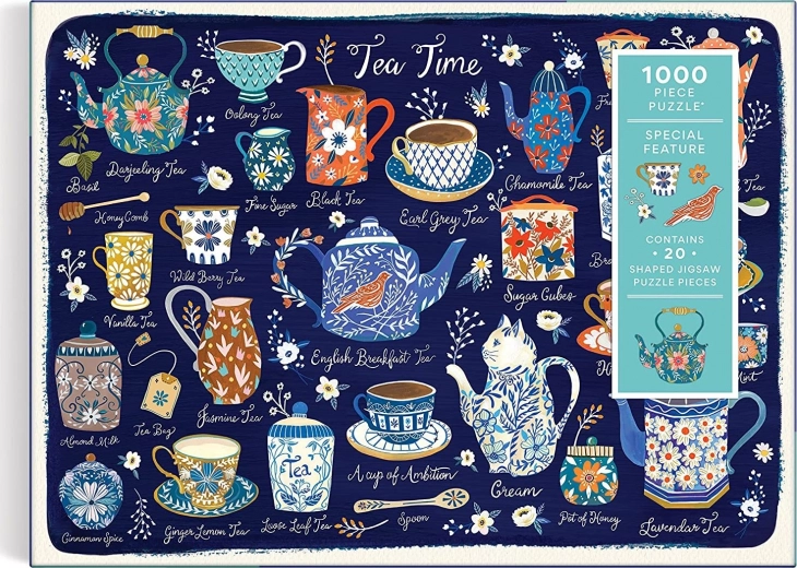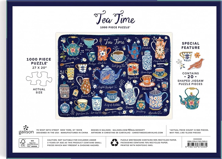 Geniet van ontspanning met een legpuzzel in het teken van een theeritueel. Deze hoogwaardige puzzel van Galison biedt 1000 nauwkeurig uitgesneden stukjes, 20 speciaal gevormde stukjes en een motief vol theepotten, kopjes en lepeltjes. Gemaakt van gerecyclede en duurzame materialen met een matte afwerking voor levensechte kleuren en details.