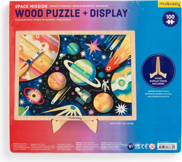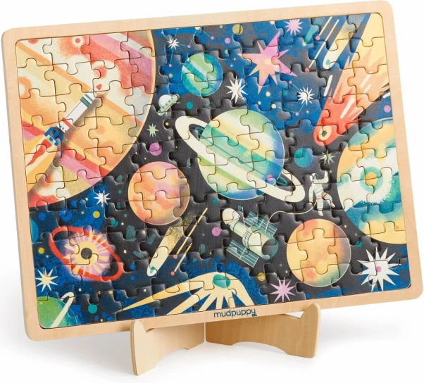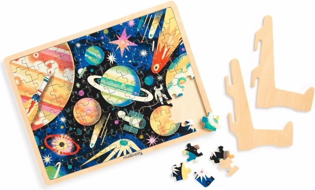 Ontdek een leuke en leerzame houten puzzel met een ruimtethema die kinderen meeneemt naar de wereld van planeten, raketten en astronauten. De puzzel van 100 stukjes biedt hoogwaardige houten afwerking, levendige kleuren en een praktische standaard om de voltooide afbeelding tentoon te stellen – een geweldige decoratie en cadeau voor kinderen vanaf 5 jaar.