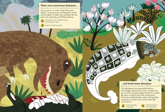 - 24 activiteiten voor creatief leren (bijv. tanden plakken bij de T. rex, de platen van de stegosaurus inkleuren)
