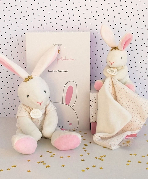Deze DOUDOU cadeauset bevat een wit pluchen konijntje met een gestipt knuffeldoekje in een compacte maat van 10 cm, gemakkelijk hanteerbaar voor baby’s vanaf de eerste levensweken. De zachte stof en subtiele kleuren zorgen voor rust en stimuleren de zintuiglijke waarneming van de baby.