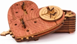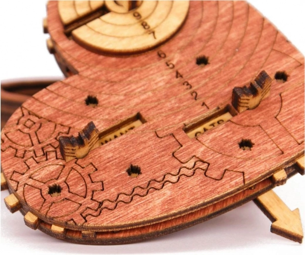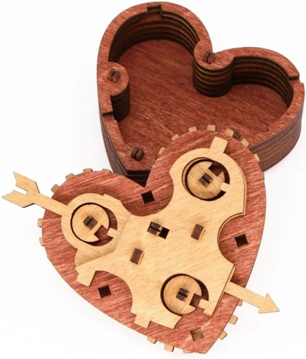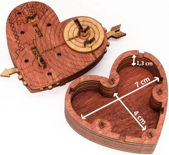Dit stijlvolle hart met tandwielen en gravures verbergt een slim codemechanisme. Na het instellen van de juiste drie woorden trek je aan de pijl en gaat het deksel open. Je kunt het hart gebruiken als veilige verpakking voor een kleinigheid, een persoonlijk bericht of als designpuzzel om neer te zetten.