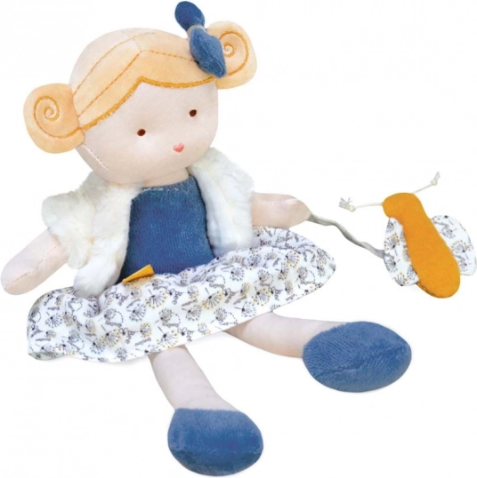 Deze betoverende pop draagt harmonieuze natuurtinten en is gemaakt van milieuvriendelijke materialen die geschikt zijn voor kinderen vanaf de geboorte. De outfit van de pop is goudgeel, oker, ecru en blauw, wat de zintuigen van kinderen prikkelt.