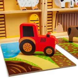 Inclusief dieren (paard, koe, hond, varken, schaap), bijenkorf en tractor. Opvallende kleuren en veilige afwerking van massief hout.