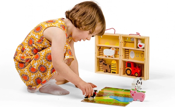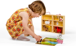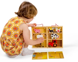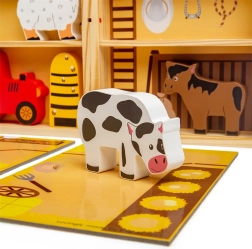 Houten dieren en de tractor nodigen uit tot open spel. Kinderen oefenen hun grijpen, oog-handcoördinatie en het vertellen van eigen verhaaltjes.