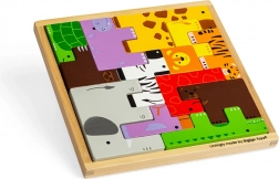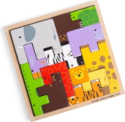 Vrolijke houten safari-puzzel met dieren van BIGJIGS TOYS ontwikkelt de fijne motoriek, oog-handcoördinatie en herkenning van kleuren en vormen. De puzzelstukjes kun je ook als figuurtjes gebruiken – een ideale speelgoedkeuze vanaf 18 maanden van veilige, hoogwaardige materialen.