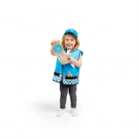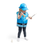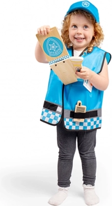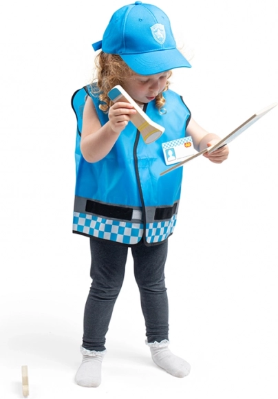 De set bevat een houten portofoon, zaklamp, identiteitsbadge, handboeien en een portemonnee voor documenten – alles afgestemd op kinderhandjes. Het kostuum is duurzaam, comfortabel en onderhoudsvriendelijk, ideaal voor dagelijks spelen, peuterspeelzaal/kleuterschool, feestjes en verkleedpartijen.
