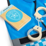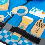 Onderdeel van de set zijn een houten portofoon, zaklamp, handboeien, identiteitsbadge en een portemonnee voor documenten – veilige en duurzame accessoires voor kleine handjes.