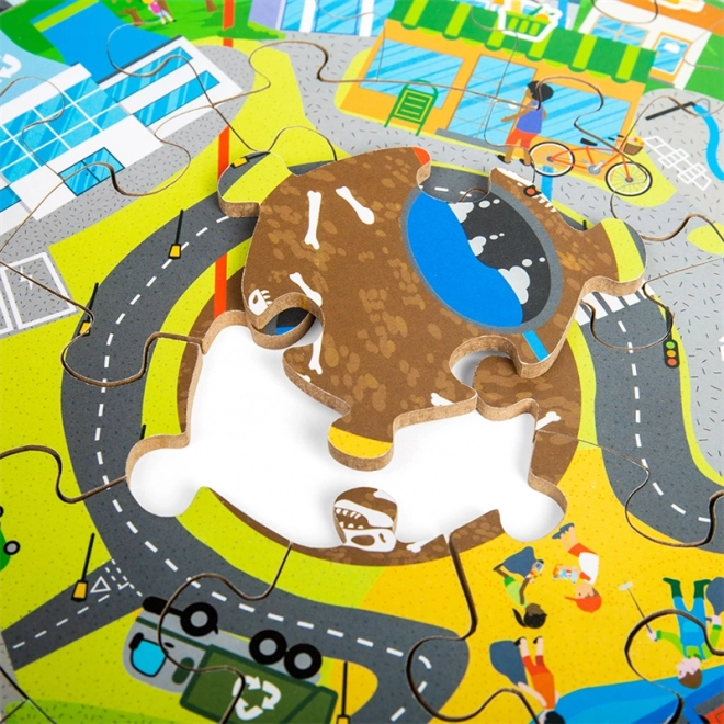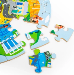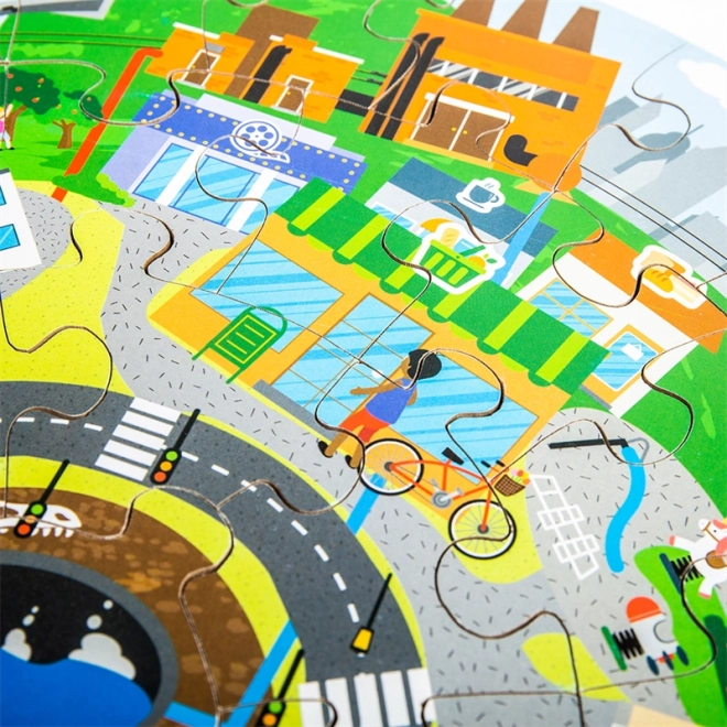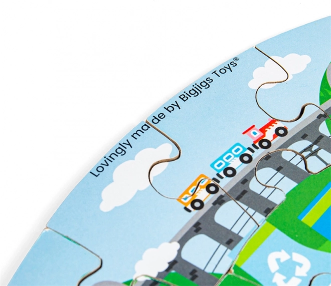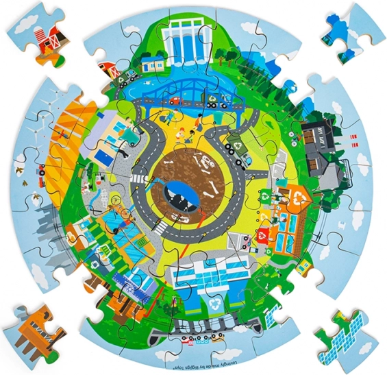 Deze hoogwaardige ronde houten puzzel is een uitstekende keuze voor de eerste educatieve legpuzzels. Dankzij de heldere kleuren en boeiende scènes uit stad en natuur oriënteren kinderen zich gemakkelijk in het thema afvalscheiding en milieubescherming.