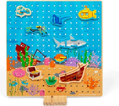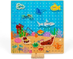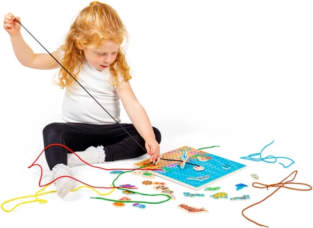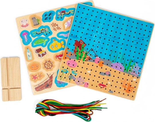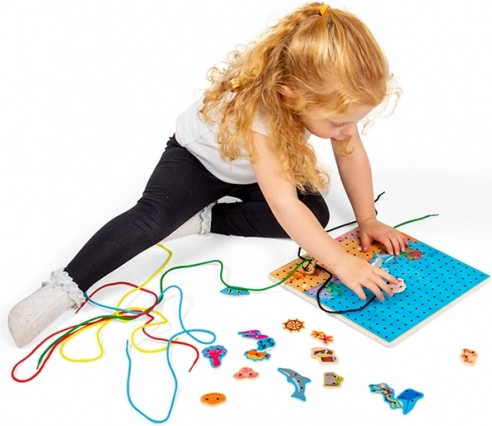 De rijgplank met onderwatermotief is een ideaal educatief speelgoed voor kinderen vanaf 3 jaar. De geperforeerde houten plank, kleurrijke veters en set zee-elementen helpen kinderen hun vingervaardigheid, fantasie en concentratie te trainen. Het spel is intuïtief en dankzij de stevige constructie van kwalitatief hout bestand tegen dagelijks gebruik.