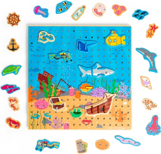 De set bevat 30 stukjes en 6 gekleurde veters waarmee je talloze scènes kunt maken – van visjes en een duiker tot een onderzeeër en een gezonken schip. De materialen zijn verantwoord verkregen en het speelgoed voldoet aan de actuele Europese veiligheidsnormen.