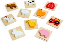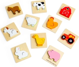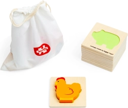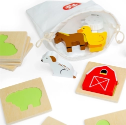 Dit reisspel met boerderijthema brengt kinderen plezier in het ontdekken. Ze steken hun hand in het stoffen zakje en zoeken op gevoel het stukje dat in de bijbehorende houten onderlegger past. Plezier dat spelenderwijs de concentratie, oog-handcoördinatie en woordenschat stimuleert bij het benoemen van dieren en voorwerpen van de boerderij.