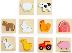 De set bevat 8 favoriete boerderijdieren en 2 boerderijthema’s (tractor en schuur). De stukken zijn stevig, kleurrijk en fijn vast te houden. Dankzij het compacte stoffen zakje is het spel perfect voor op reis, in een restaurant of bij de grootouders.