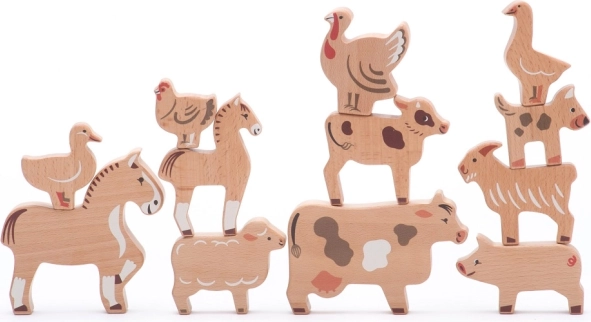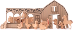 Deze hoogwaardige set omvat geliefde boerderijdieren: paard, veulen, geit, hond, varkentje, kalf, koe, kalkoen, gans, eend, kip, schaap, konijn en kat. Dankzij de zorgvuldige afwerking van beukenhout liggen de figuurtjes prettig in de hand, zijn ze stabiel en ideaal voor dagelijks spelen.