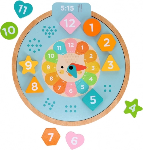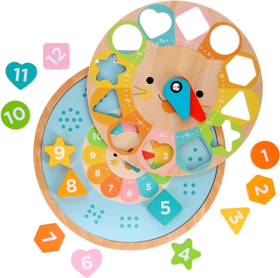 Bevat beweegbare wijzers en vormen die kinderen op de juiste plaats kunnen zetten, wat hand-oogcoördinatie en fijne motoriek stimuleert.