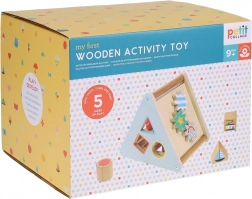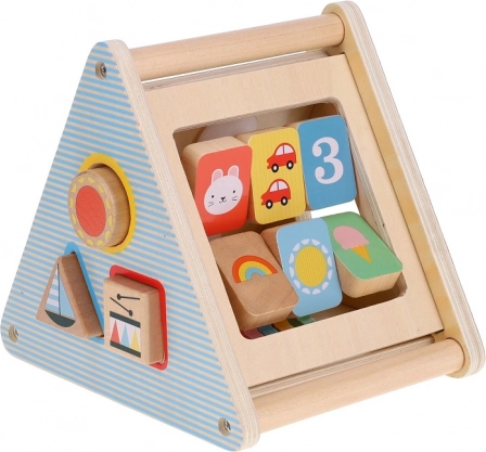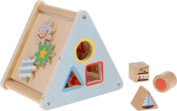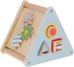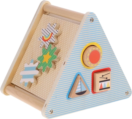 Het speelgoed bevat verschillende uitsparingen voor het plaatsen van vormen en tandwielen, die helpen bij de ontwikkeling van fijne motoriek.