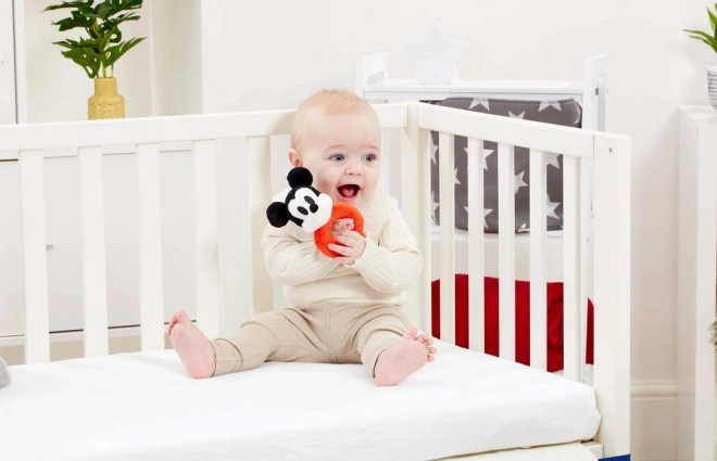 De pluchen rammelaar MICKEY MOUSE in de geliefde zwart-wit-rode uitvoering is een geweldige metgezel voor de eerste ontdekkingen. De zachte materialen voelen prettig aan, terwijl het subtiele gerammel het kind motiveert om te bewegen, te schudden en te verkennen.
