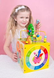 Ontdek de leuke en leerzame motorische kubus van Bino, die kinderen spelenderwijs helpt vaardigheden te ontwikkelen. Elke zijde van de kubus biedt een andere activiteit, zodat kinderen de oog-handcoördinatie kunnen trainen en hun concentratie kunnen verbeteren.