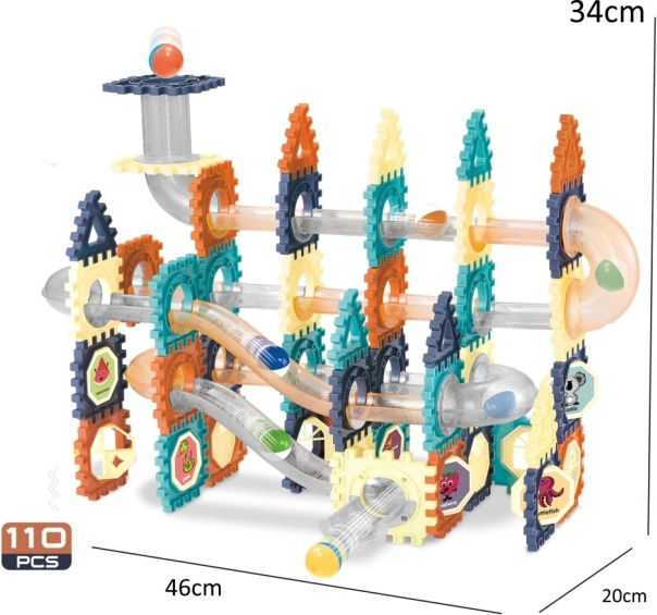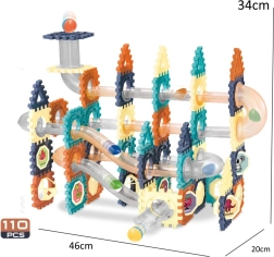Ontdek een wereld vol plezier met deze knikkerbaan-bouwset, die 110 verschillende onderdelen biedt voor dynamische banen en driedimensionale scènes. Kinderen kunnen experimenteren met vormen en routes, originele constructies bouwen en knikkerwedstrijden houden of domino spelen.