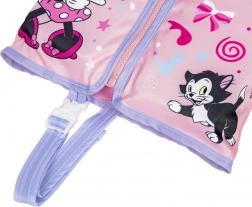 Voor maximaal comfort en veiligheid is het voorzien van een voorrits met beschermflap en een verstelbare kruisriem die voorkomt dat het vest omhoogrolt. De textiele buitenlaag met UPF 50+ is aangenaam aan te raken en bestand tegen vervagen. Het vest is bedoeld als hulpmiddel voor zwemonderricht en moet altijd onder toezicht van volwassenen worden gebruikt.
