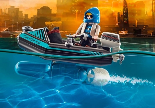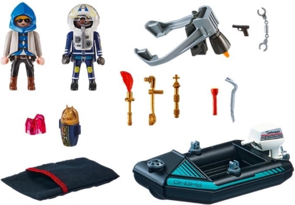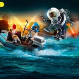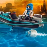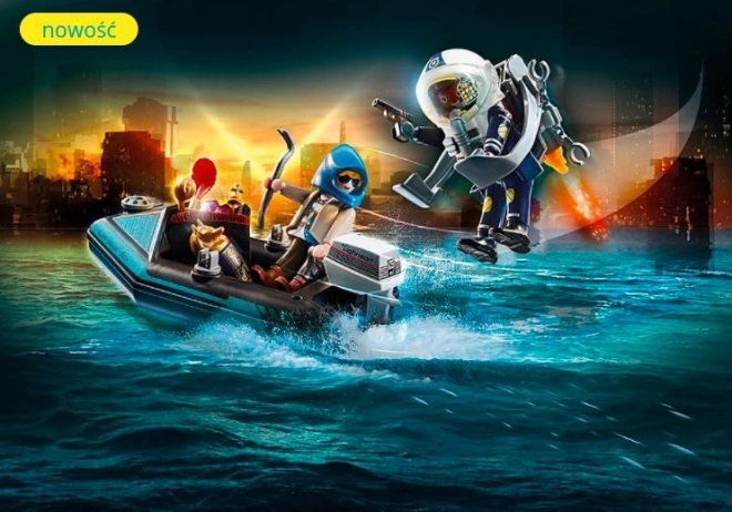 Alles is klaar voor actie in Playmobil City Action. De politieagent met jetpack nadert snel de dief die met gestolen kunst op de boot ontsnapt. Dankzij zijn slimheid en uitrusting weet de agent de crimineel snel te overmeesteren en de waardevolle objecten naar het museum terug te brengen.