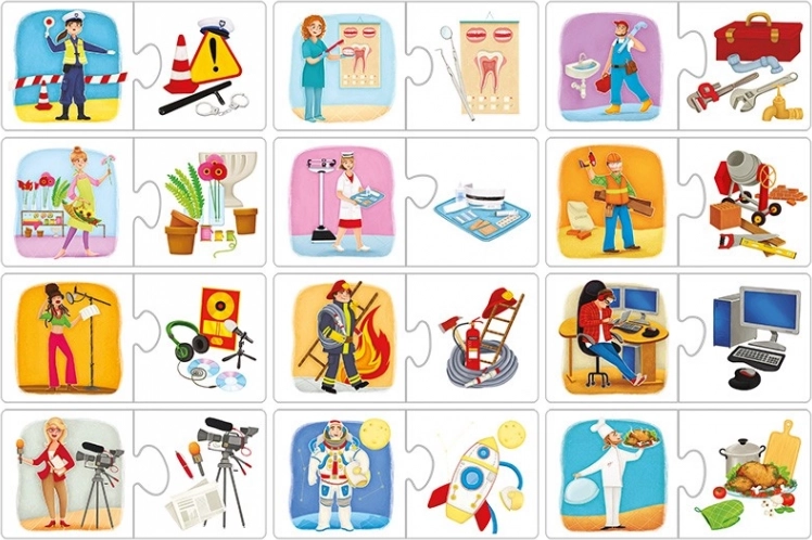 De set bevat 24 puzzelstukken, waarmee 12 afbeeldingen kunnen worden samengesteld die beroepen en eigenschappen uitbeelden.