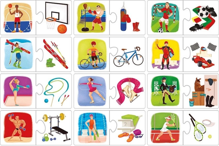 Ontdek een leuke educatieve puzzel die kinderen vanaf 3 jaar kennis laat maken met de wereld van sport. De set bevat 24 stukjes om 12 paren van sporters en hun uitrusting te vormen. Stimuleert fijne motoriek, oog-handcoördinatie en observatievaardigheden. Dankzij de kleurrijke illustraties leren kinderen gemakkelijk verschillende sporten en hun attributen. Geschikt voor 1–2 spelers, ideaal om samen te spelen met ouders of vriendjes.